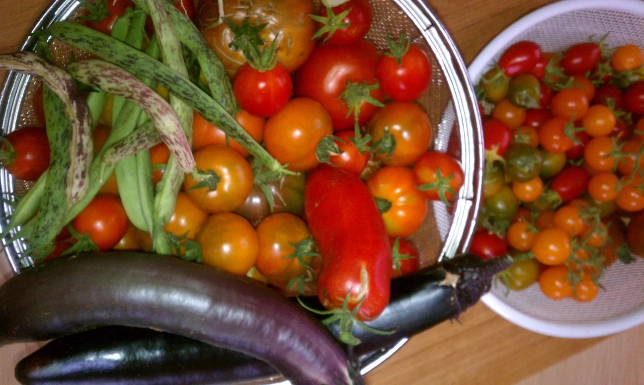 The beginnings of my food supply from my ‘toil in the soil’. Some of my tomatoes taste as interesting as their names: Frankenstein Black, Isis Candy, Kelloggs Breakfast, Indigo Apple, Chocolate Cherry..yummmm